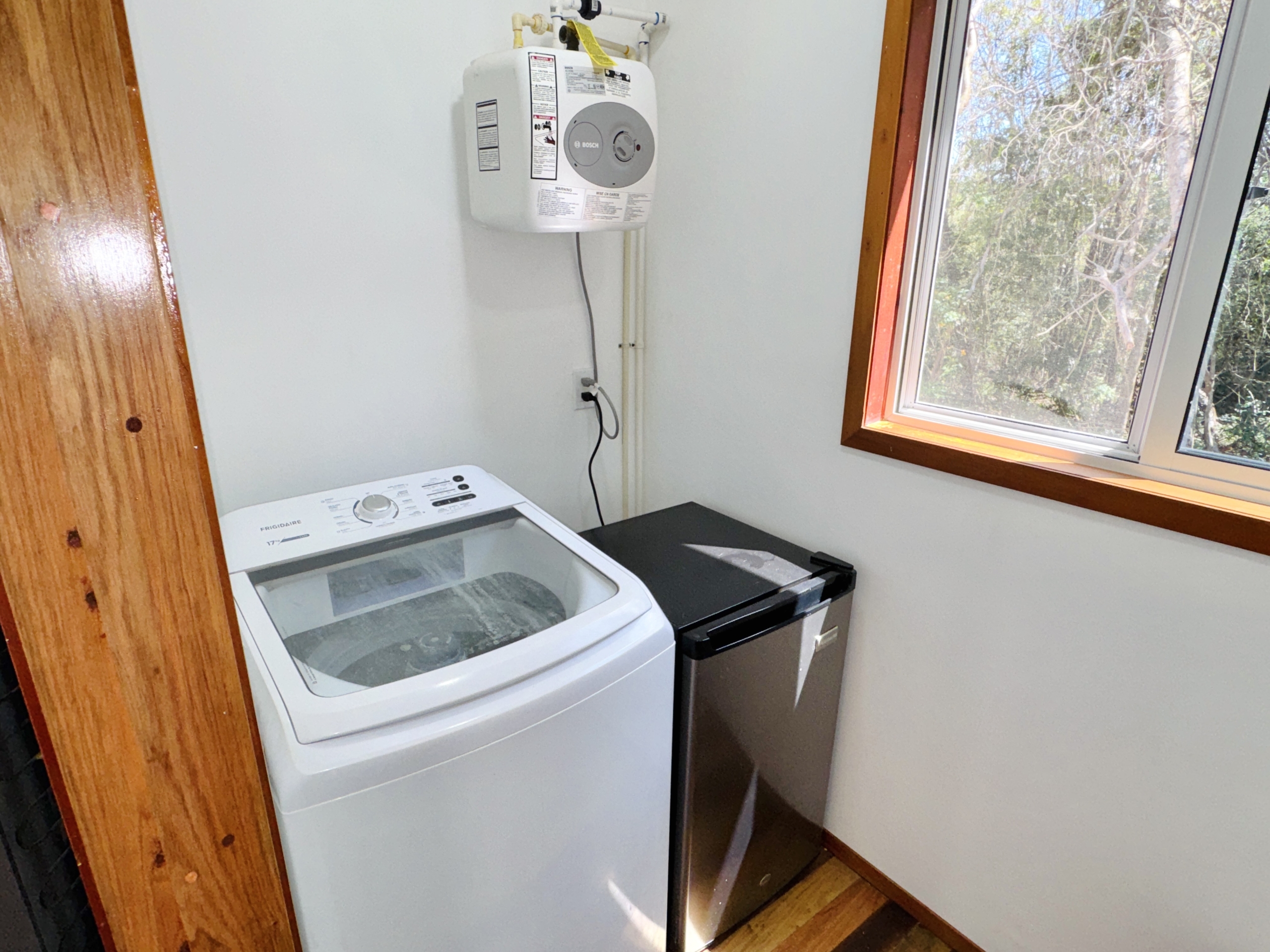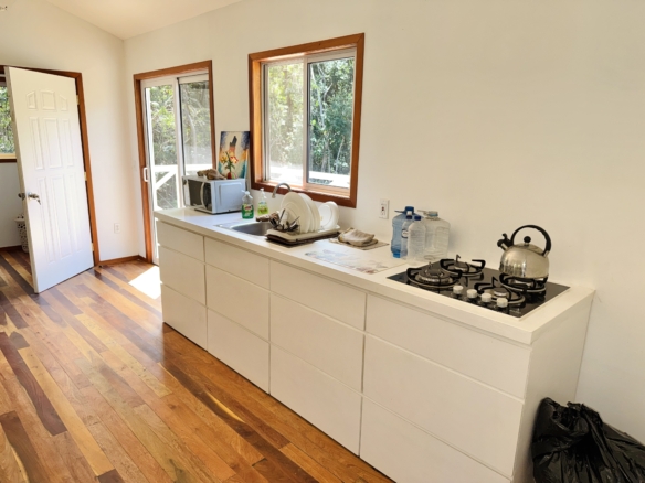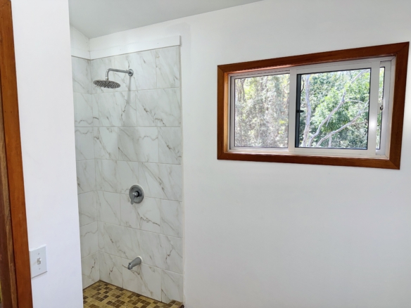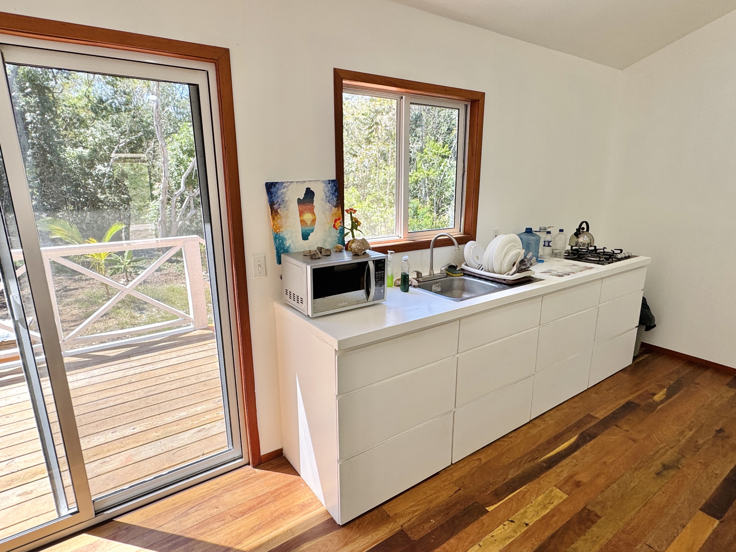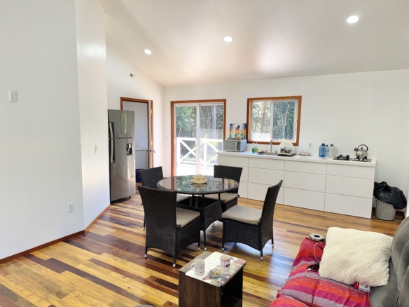 This cozy and tranquil cottage presents a peaceful escape surrounded by lush greenery inviting peace. Nestled not too far from the village center, the sea and between the tranquil woods this a great option for nature lovers. This cozy home features rustic wood finishes, ample space and glass sliding windows inviting natural light and wonderful views of the surrounding forest.